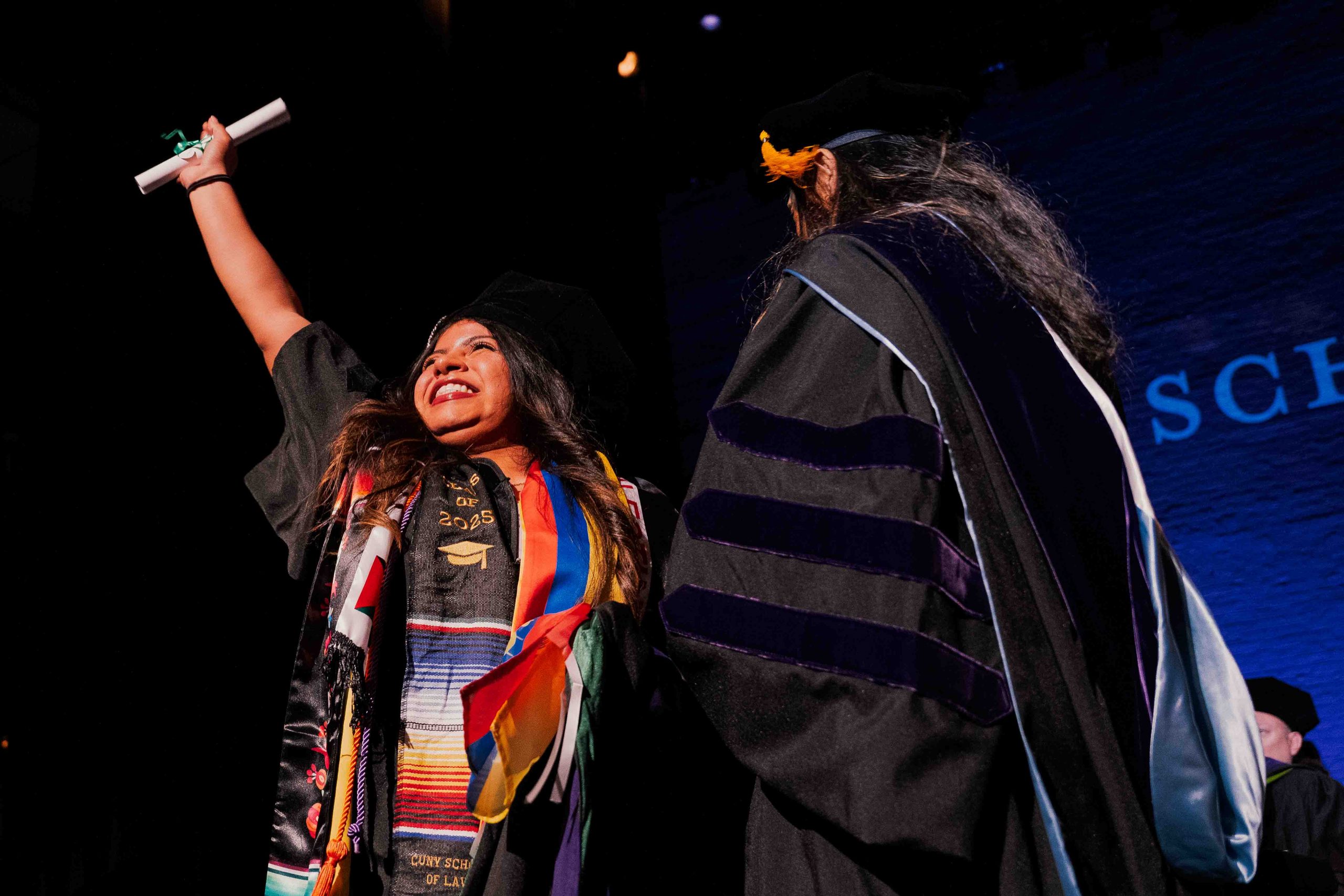 For the second time, CUNY Law’s commencement was held at the historic Apollo Theater in Harlem. Speakers remarked on the significance of this moment in history. “As you move forward into a world marked by mounting threats to the rule of law, efforts to restrict fundamental rights, and attempts to discourage those who defend them, your role as lawyers trained at CUNY Law carries particular weight. Few are as prepared as you are to meet this moment with both skill and purpose. This is the kind of lawyering our world needs now,” Dean Sudha Setty noted, “That pressure is real, but so is your preparation and your purpose. This is the work ahead, and you are ready for it.”