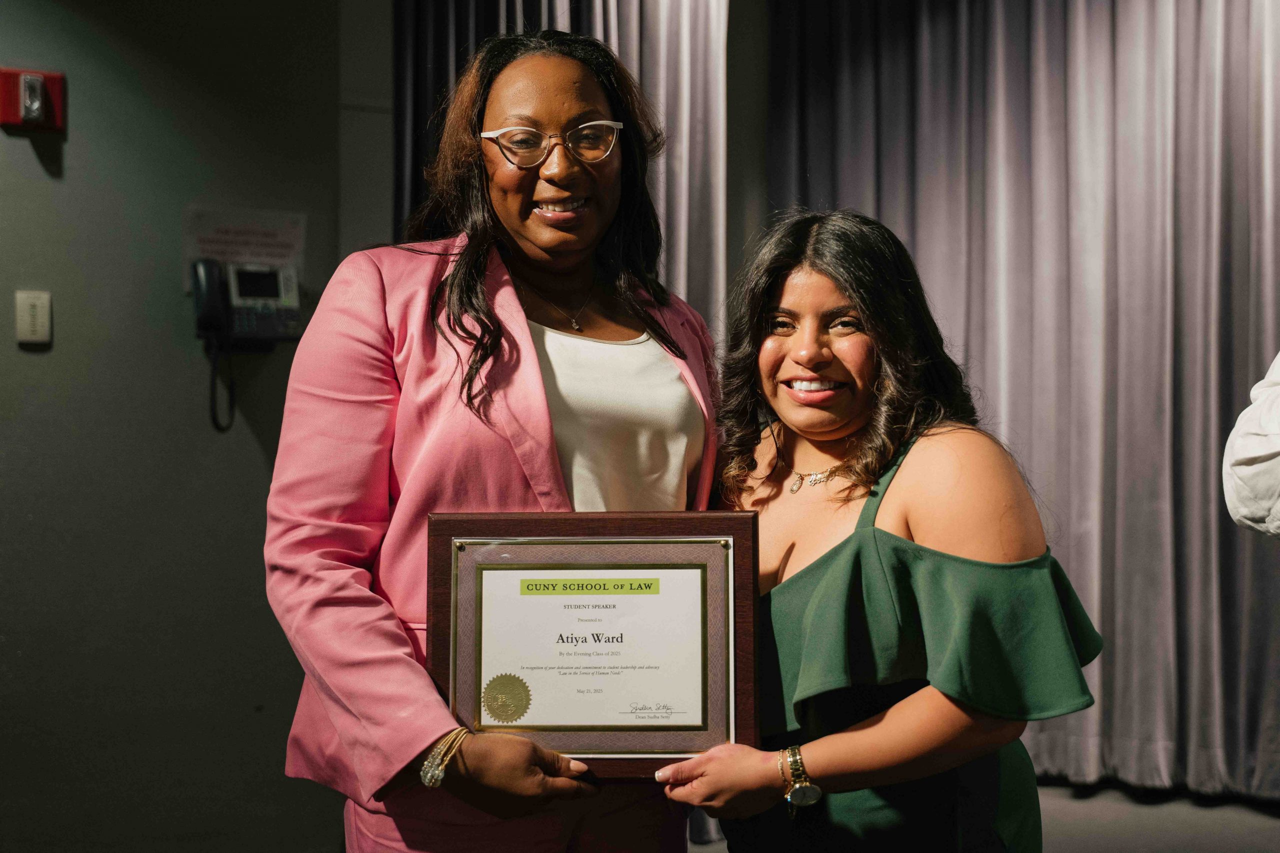 On Wednesday, May 21, Student Awards Night was emceed by 2025 graduate Amada Guapisaca, who introduced each of the recipients of the night’s student-selected honors. Karyn Manocchia, the longtime head of Events at the Law School, received the Community Service Award and raised a glass to her colleagues in both the Events and Facilities departments for all their support and hard work. Tarek Z. Ismail, Co-Director of the Family Law Defense Clinic, was presented with the Outstanding Professor Award and delivered a moving speech that noted that while it was harder than ever to be the kind of lawyer who uses law in the service of human needs, the graduating class of would find power in people, through their relationships, and from their communities.